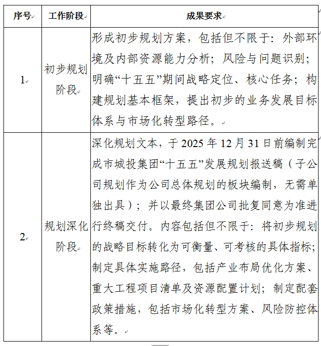 1.服務(wù)內(nèi)容:本次采購旨在選取專業(yè)規(guī)劃咨詢服務(wù)單位,通過專業(yè)機(jī)構(gòu)的深度謀劃,助力集團(tuán)公司在“十五五”期間明確發(fā)展方向,優(yōu)化資源配置,提升核心競爭力,為實現(xiàn)遠(yuǎn)期戰(zhàn)略目標(biāo)奠定堅實基礎(chǔ)。服務(wù)內(nèi)容包括但不限于:外部環(huán)境及內(nèi)部資源能力分析、企業(yè)發(fā)展規(guī)劃目標(biāo)及業(yè)務(wù)布局、國企轉(zhuǎn)型措施、重大任務(wù)及保障措施、實施計劃、具體實施細(xì)則以及在“十五五”推進(jìn)中進(jìn)行中期和末期評估等方面。方案需在2025年9月20日前完成初稿,2025年12月31前完成報送稿,根據(jù)反饋意見在采購人要求的時間內(nèi)完成修正稿(終稿)。